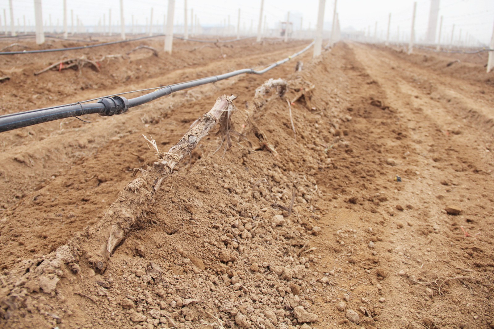 沒有埋土的葡萄樹,工人們修剪之后,用繩子將它固定在鐵架上,然后在葡萄樹根部進(jìn)行滴灌,此時(shí)澆水主要是讓葡萄樹吸收足夠的營養(yǎng),為今年的生長結(jié)果打下基礎(chǔ)。